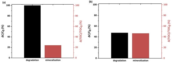 Figure 2 shows the photocatalytic degradation percentage and total organic carbon concentration (TOC) removal for the TMX (10 ppm) and FND (10 ppm) pollutants, following the UV-A irradiation of aqueous solutions for 90 min, in the presence of titania P25. Thus, the degree of their mineralization was determined, and the effectiveness of the photocatalytic process was comparatively evaluated. It can be seen that after 90 min under UV-A irradiation, the carbon content percentage drops to 76% and 53.5% for the TMX and FND, respectively. This means that 24% of the TMX was mineralized after 90 min irradiation time, although the degradation for TMX was almost complete, probably due to the presence of intermediate organic products. Thus, the observed delay in the mineralization process with respect to the corresponding photocatalytic degradation degree is expected, as the recalcitrant parent compounds should be first converted to intermediate fragments, which undergo a progressive transformation leading to CO2 and inorganic species as final products, until the complete removal of the organic load after ~4.5 h (Figure S2). Moreover, the degradation of the FND parent closely follows its direct mineralization in contrast to the TMX parent, while for both pesticides, mineralization presents a linear dependence with time (Figure S2). However, despite the presence of organic matter in the photocatalytically treated pesticide solutions indicated by the TOC analysis, no toxic by-products were detected, with the exception of traces (<0.0004 ppm) of clothianidin and 4-(Trifluoromethyl)nicotinoyl glycine degradation products of the TMX and FND, respectively [10,34]. Even if the analytical examination by HPLC-MS was limited only to expected toxic by-products of FND and TMX, these results clearly demonstrate the ability of the TiO2 photocatalyst to degrade hazardous contaminants and its potential use in wastewater purification technologies.