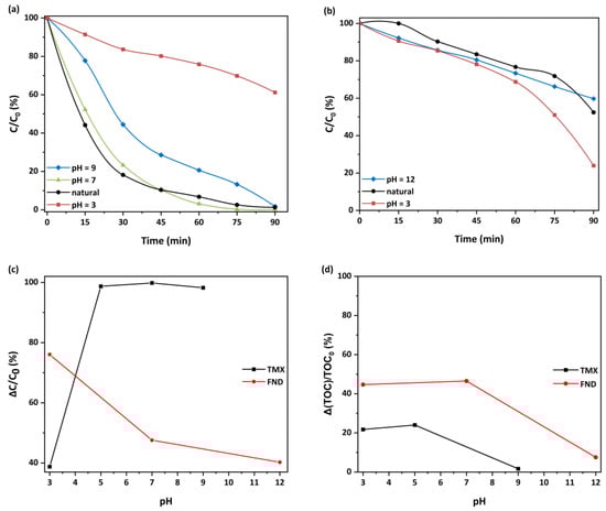 As the pH of real water varies relatively to the climate conditions and the type of effluents, the affinity between the organic molecules and the surface of the photocatalyst is highly correlated with the pH of the water matrix. In this work, we have considered that it is extremely important to conduct a thorough investigation of the effect of the pH on the photodegradation kinetics of TMX and FND. Regarding the catalyst, TiO2 is a chemically stable semiconductor exhibiting a point of zero charge close to 6.2, meaning that it can be positively charged below pH = 6.2, or negatively above this value [35]. On the contrary, the pesticides could only be charged negatively if polarization occurs, while there are some studies reporting that the half-life of TMX is reduced in a strong alkaline environment [7,36]. The experiments were performed at a concentration of 10 ppm for both pesticides, whereas the pH was selectively adjusted by the addition of HCl (0.1 M) and NaOH (0.1 M). It should be noted that the choice of 10 ppm allows for the tracking and examination of the degradation alterations with time, regardless of the kinetics enhancement or hindering with pH adjustment. Moreover, the pH values of the starting TMX and FND solutions were 5 and 7, respectively. Therefore, the respective experiments were performed with no addition of HCl or NaOH.