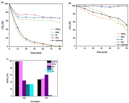 Radical trap experiments of (a) thiamethoxam (TMX); and (b) flonicamid (FND) in the presence of appropriate scavengers: IPA for •OH quenching, KI for h+, BZQ for O2•− and KΒrO3 for e−; (c) Scavengers’ effect on the photocatalytic degradation performance for both pesticides.
