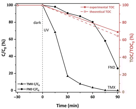 Photocatalytic experiments were also performed in the presence of both pesticides to access the potential of the titania photocatalyst in more realistic conditions. The results of the photocatalytic degradation and carbon removal (TOC) for the mixture (5 ppm of TMX and 5 ppm of FND) after 90 min are shown in Figure 5, and their comparison with those of Figure 1a,b indicates that the photocatalytic kinetics and removal percentage in the mixture is almost identical to the performance achieved in the single pollutant experiments. Indeed, the excellent photocatalytic efficiency of the titania catalyst toward TMX was preserved. Regarding the FND, the photocatalytic degradation reaction remains relatively slow and proceeds with a significantly low rate, until the acceleration after 60 min, as observed in the aforementioned isolated experiments. Furthermore, the TOC analysis enabled the calculation of the mineralization degree of the pesticide mixture. As such, the mineralization efficiency in the mixture is compared to the average of the mineralization efficiencies achieved in the single solute experiments. In this context, a first observation reveals that the mixture mineralization proceeds at a slower rate compared to the respective degradation rates. In particular, the carbon removal efficiency of the mixture reached up to approximately 31%, which adequately coincides with the theoretical efficiency of 35%, as produced by averaging the efficiencies achieved in the single solute experiments (dashed line in Figure 5).