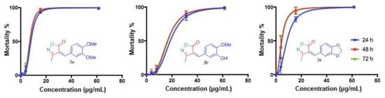 Initially, an investigation was carried out with the screening of the larvicidal activity of the compounds obtained to evaluate the lethality of the larvae (L3) of Ae. aegypti based on the method at low concentrations and small scale (Table 4). As a main result, compounds 3a, 3b, and 3e showed better activities. Thus, they were submitted to the larger scale tests according to the WHO guidelines criteria [39] and still showed good larval mortality (Figure 2).