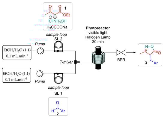 The experimental set-up is depicted in Scheme 2. A 0.5 M solution of aromatic aldehydes in 50% aqueous EtOH (2.0 mL) in an injection loop (SL1) was mixed using a syringe pump, in a flow rate of 0.1 mL min−1 (feed A in EtOH), with a 0.5 M solution of hydroxylamine hydrochloride, sodium acetate, and ethyl acetoacetate (in 2.0 mL of EtOH), which was pumped at the same moment from the other injection loop (SL2) with an equal flow rate (feed B in EtOH). The resulting combined solution was pumped through a 4 mL fluorinated ethylene-propylene (FEP) reactor coil (irradiated by a 150 W halogen lamp) with outer (OD) and inner (ID) diameters of 1.6 and 0.8 mm, respectively. A 2-bar back pressure regulator (BPR) was used to assure precision in the residence time (see Supplementary Material for more details on the experimental set-up).