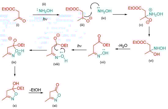 Initially based on a simplified mechanistic proposal [28], a more complete one is depicted in Scheme 3. Under the incidence of light, the reaction is initiated by an electron transfer from hydroxylamine (ii) to the ketone carbonyl group of ethyl acetoacetate (i). A radical anion (iii) and a radical cation (iv) are formed, which are reactive and somewhat stable species that react with each other quickly, giving rise to the ionic species of the tetrahedral intermediate (v), which is neutralized by a proton exchange, yielding intermediate (vi). Afterwards, the isoxazolone (xi) is formed by photolactonization, where again there would be an electron promotion with the oxidation of the oxime oxygen (vii) and the reduction of the carbonyl oxygen, forming a radical anion and a radical cation (viii) that react with each other intramolecularly to yield (ix). Finally, loss of a molecule of ethanol yields the isoxazolone (xi), which would lead to the final product through a non-specified photo-Knoevenagel process according to Ghosh et al. [43].