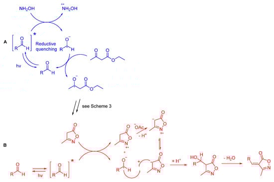 Thereby, the PET cycle for photoredox MCR begins with the formation of the excited state of the aldehyde (*), which is reduced by hydroxylamine via SET (Scheme 4A). The ketyl radical ion formed in this process returns to the initial state of the catalyst through the reductive quenching cycle, where the ketyl anion-radical was quenched by accepting an electron from the carbonyl group present in the β-ketoester. Finally, the combination of the radical species formed in the reaction medium via PET, after the steps described in Scheme 3, leads to the formation of the isoxazolone compound.