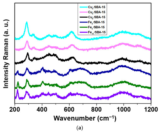 Raman spectra of selected samples are obtained to investigate the structural features of the solids upon addition of distinct Cu and Fe loadings (Figure 1a). As expected, vibration bands due to metal oxides incorporated into the solids are observed at a range of 200–1200 cm−1 for all samples. For Cux/SBA-15 samples, the Raman spectra depict a very strong band near 287 (Ag) cm−1 accompanied by a weak band at about 340 cm−1 (Bg), which is obviously evidence of Cu4/SBA-15. These bands reveal the presence of the tenorite CuO phase, as suggested by XRD. Moreover, CuO belongs to the C2/c space group (C62h), with a monoclinic structure with two molecules per primitive cell [23,24,25]. This type of structure normally has three acoustic modes (Au + 2Bu), six infrared active modes (3Au + 3Bg) and three Raman active modes (Ag + 2Bg) [24]. Additionally, other bands found for Cu-containing samples are visible at 446, 493 and 623 (B2g), corresponding to main modes of CuO, whereas those at 990 and 1111 cm−1 can be ascribed to the Si–O vibrations in a structure unit with two and one non-bridging oxygen atoms per silicon, respectively [25]. Importantly, typical bands for bulk CuO do not shift upon varying the Cu loadings, although the band around 960 cm−1 assigns for finely dispersed CuO species in strong interaction with surface silanol from SBA-15 support [24,25].