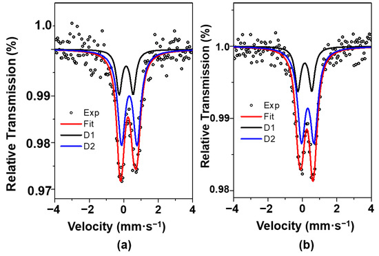 Both spectra are fitted to two doublets, namely D1 and D2, with isomer shifts and quadrupole splittings values similar to the ones presented for Fe3+ species [36]. In line with these results, Mössbauer spectra of Fe-based oxides have a doublet with the isomer shift of 0.30 mm·s−1 and quadrupole splitting of 0.76 mm·s−1, which may be related to superparamagnetic (SPM) Fe3+ species [37].