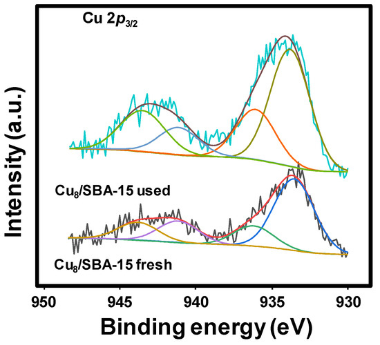 The Cu 2p3/2 core level spectra of the fresh and used samples are shown in Figure 4. The Cu 2p3/2 spectra can be decomposed into four contributions with the main peaks at 933.5 and 936.2 eV for Cu8/SBA-15 fresh sample. The former contribution at 933.5 eV is assigned small clusters of copper interacting with the support, or even reduced copper, and the high binding energy contribution (936.2 eV) is ascribed to the presence of CuO particles [24,43].