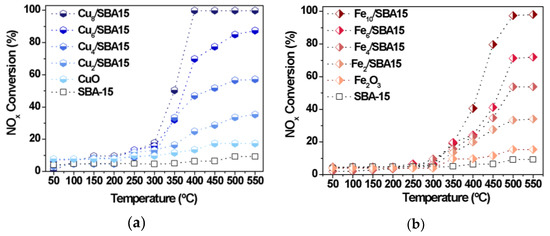 NOx conversions as a function of the temperature. (a) Cux/SBA-15 and (b) Fex/SBA-15 series of solids.