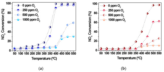 NOx conversions as a function of the temperature in the presence of distinct amounts of oxygen over (a) Cu8/SBA-15 and (b) Fe10/SBA-15 samples.