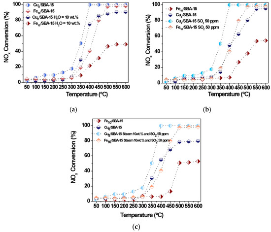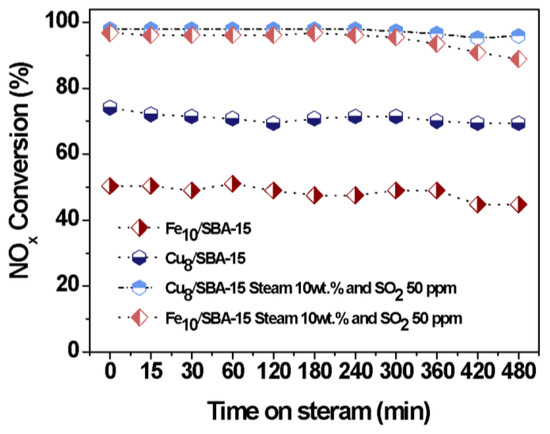 When both SO2 and water vapor are used as poisons (Figure 9c), the catalytic performances of the solids follow a similar behavior to those of individual poisons and the NOx conversions drop dramatically to values below 15% at temperatures inferior to 350 °C. As the temperature increases, the NOx conversions of Fe10/SBA-15 gradually rise but are still lower than those of Cu8/SBA-15. This result clearly indicates that the sulfates and sulfuric acid formation on iron sites are the main factor for the deactivation of the former solid at relatively low temperatures of nearly 400 °C [3]. In contrast, a relatively higher catalytic activity is achieved at temperatures above 400 °C due to the fact that heating facilitates the breaking of the Fe-S bond, thereby providing better availability of the Fe active centers for NOx and CO. In the case of Cu8/SBA-15, NOx conversions experience a decay at low temperature, but activity increases significantly in the whole temperature range. The highest NOx conversion is 75% at 400 °C, which is thought to be due to the resistance of Cu sites to simultaneous SO2 and water vapor poisons.