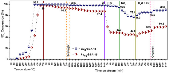 Long term stability runs over Cu8/SBA-15 and Fe10/SBA-15. NOx conversions obtained in the 30–550 °C temperature range and time on steam intervals of 30–1440 min. The runs were carried out in presence (absence) of steam 10 wt.%, SO2 50 ppm or both steam 10 wt.% and SO2 50 ppm.