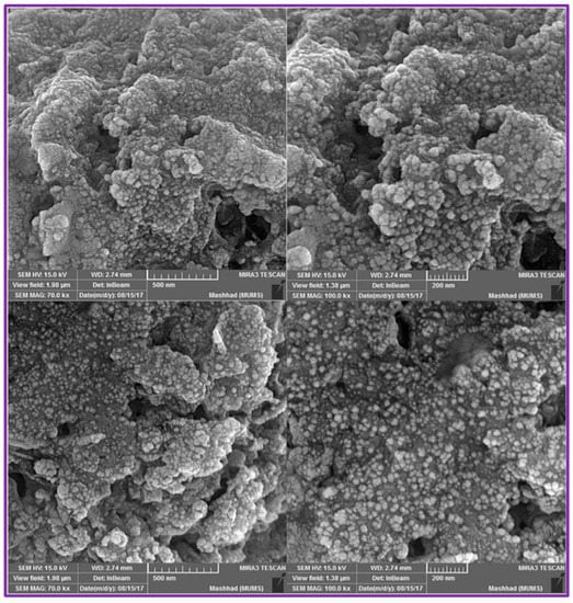Huo et al. reported a hydrothermal method for the preparation of GCDs from grapefruits. They prepared three types of GCDs: undoped green carbon dots (UGCDs), UGCDs-peel and nitrogen-doped green carbon dots (N-GCDs) [9]. The three types of GCDs showed size-dependent absorption and emission properties plausibly due to their difference in surface energy states. As the size increases in the UGCDs-peel, it exhibited a red-shifted PL emission compared to others [9]. Size dependency was also reported by Ahmadian Fard Fini et al. in a separate hydrothermal method [33] as shown in the scanning electron microscopy (SEM) image in Figure 1 [33].