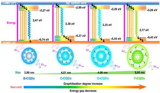 Classification of GCD based on their size and emission properties. While smaller GCDs emit blue color, the red shifting of emission occurs as the GCD size increases. Reproduced with permission from Zhu et al. [7].