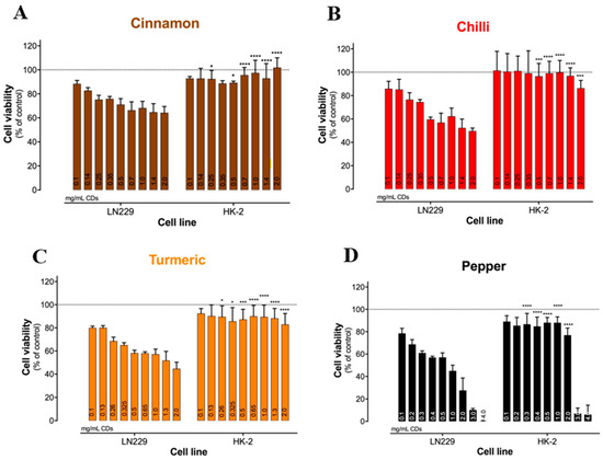 Cell viability evaluation in two different types of cells (cancerous LN229 cells and normal HK-2 cells) after a 24 h incubation with increasing concentrations of: (A) cinnamon, (B) red chili, (C) turmeric and (D) black pepper carbon dots. Represented results are mean ± SD of at least three independent experiments. * p < 0.05, *** p < 0.001 and **** p < 0.0001 are for statistical significance of differences between the effect of the same concentration of spice-based carbon dots in other cell line (LN229). Adapted from ref. [19].