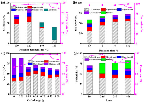 For the optimized 2RuOx/CaO catalyst, the reaction parameters, including reaction temperature, time, CaO dosage and catalyst stability, were investigated for the conversion of glucose to LA. As shown in Figure 1a, the selectivity to LA displayed a volcano curve as a function of temperature and was maximized to 54.3% at 120 °C with the conversion of glucose maintained at 95% at temperatures between 100 °C and 160 °C. When the reaction temperature was higher than the optimal point of 120 °C, the yield of LA decreased dramatically with a concomitantly increased yield of acetic acid. The reason for this should be attributed to the random decomposition of glucose and the oxidative decarbonylation of LA due to the metastable of glucose and LA at high temperatures. The influence of reaction time is shown in Figure 1b. At the 0.5 h reaction, the glucose conversion reached 93.1% with ca. 30% LA selectivity. Prolonging the reaction time to 2 h led to the increased LA yield, mainly due to the cascade conversion of the key intermediate of fructose to the downstream product. It is worth noting that even further extending the reaction time, the product compositions remained almost unchanged, confirming the good stability of LA in the present reaction system. The reaction atmosphere was also tested, as seen in Figure S1. Although the conversion of glucose to LA did not need the participation of O2, the presence of O2 herein encouraged the synthesis of LA in comparison to that in the N2 atmosphere. The enhanced performance should be related to the catalyst state under the oxidation conditions, e.g., RuOx species.