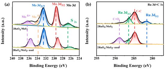 The chemical states of Mo and Ru species on the catalysts were investigated by XPS (the whole spectrum is shown in Figure S4). As shown in Figure 5a, for the catalyst of 2RuOx/MoS2, three valence states of Mo species were identified, including the dominant Mo4+ (229.09 eV and 232.28 eV) and a small amount of Mo5+ (233.45 eV) and Mo6+ (235.56 eV) [46,47]. Since no MoO3 related signals were observed by Raman characterizations, it was speculated that the high-valence Mo species was distributed in the bulk phase of MoS2. Through the catalytic reaction, the proportion of Mo6+ increased by 8.95% after reaction, which may be caused by the partial oxidation of the carrier under the oxidizing atmosphere. For the Ru spectra in Figure 5b, the signal of Ru 3d overlaps with that of C ls. By means of deconvolution analysis, the Ru4+ species in the form of RuO2 (280.93 eV and 286.08 eV) were observed [48]. After the reaction, characteristic peaks assigned to RuO2 vanished, which should be attributed to the tendentiously deposition of CaCO3 onto the metal sites of the 2RuOx/MoS2 catalyst, agreeing with our hypothesis that the Ru species were covered to decrease the activity, rather than the deactivation of 2RuOx/MoS2 catalysts.