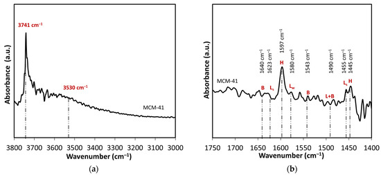 FTIR spectroscopy was studied in both hydroxyl stretch (3500–3800 cm−1) and fingerprint (1400–1800 cm−1) regions, the latter in conjunction with pyridine adsorption for acidity determination (Figure 2). FTIR spectra of pyridine adsorption (Figure 2b) on MCM-41 shows prominent bands at 1597 cm−1 and 1445 cm−1 associated with hydrogen-bonded (H) pyridine [39]. Yet bands corresponding to weak (LW) and strong (LS) Lewis acid sites (1623, 1580, and 1455 cm−1) are not discernible, nor are bands related to Brønsted (B) acid sites, consistent with the lack of acidity in metal-free silica.