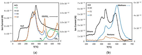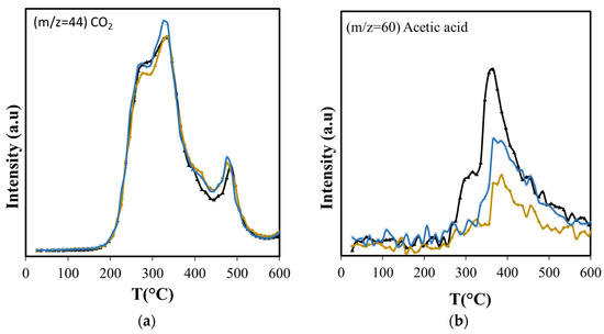 Using the NIST mass spectrometry database [52] as a guide it was possible to identify and follow 28 compounds, with online MS analysis, that comprise the most abundant pyrolysis products. These results appear in Figure 4, Figure 5 and Figure 6 and show the results from room temperature to 700 °C. Figure 4a shows the production of the main non-condensable gases (CO/CO2) and water generated during pyrolysis. The drying of the sample occurs before 200 °C in agreement with the TGA results. ASB decomposition starts at this temperature with the appearance of CO2, with a peak at around 300 °C. This is consistent with hemicellulose thermal decomposition. As reported by others, the maximum production of water and CO2 occurs between 243 °C and 332 °C, depending on the type of hemicellulose [53]. A third event is marked by water and CO2 emissions reaching maxima at 350 °C and 340 °C, respectively, and can be related to cellulose thermal decomposition. Additionally, a second stage of cellulose decomposition is evidenced by a shoulder at 400 °C, probably due to the presence of a more stable crystalline cellulose [54,55]. A fourth event defined by CO2 and water emissions that start at 450 °C and reach a maximum at 485 °C is related to lignin thermal decomposition. Finally, a fifth event begins at 575 °C with maximum CO2 production at 675 °C, corresponding to a charring and/or gasification process of residual biomass. During the last two events, there is hydrogen production with a maximum at 585 °C, in contrast to CO2 and CO production that show a minimum at similar temperatures (575 °C).