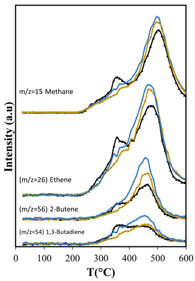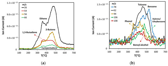 Light olefins are produced mainly from cellulose and lignin thermal decomposition. The maximum production of ethene, 2-butene, and cyclopentadiene occurs close to 475 °C (see Figure 5a), suggesting that they are produced mostly from lignin, while the 1,3-butadiene peak with a maximum at 350 °C implies it is produced principally from cellulose, but also from lignin.