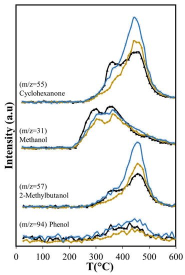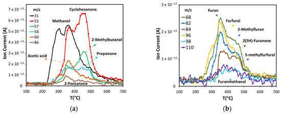 Other volatile compounds formed during the pyrolysis include ketones, alcohols, acetic acid (Figure 6a) and furan derivatives (Figure 6b). Methanol is produced at low temperature, starting at 235 °C, and its production shows two peaks with maxima at 300 °C and 355 °C. The first is related to hemicellulose decomposition, and the second to lignin decomposition, in agreement with observations from other researchers [56,57]. Several ketones produced by cellulose and lignin thermal decomposition were detected: 2-pentanone, cyclohexanone, and propanone. Two of these ketones, cyclohexanone, and propanone, along with 2-methylbutanol, have the major production after 400 °C, with the maximum near 455 °C. This occurs when cellulose is already decomposed, thus the most likely source of these compounds is lignin, in agreement with other works [58,59]. The maximum production of acetic acid and 2-pentanone occur in the same range of temperatures as the first peak of cyclohexanone and the second of methanol. Acetic acid is produced from the carbonylation of methanol produced from hemicellulose and the carbon monoxide produced from hemicellulose and cellulose [60].