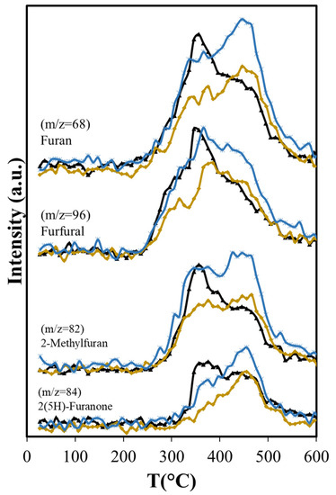 The group of furan and its derivatives (Figure 6b) have curves that show a marked high production at 355 °C due to cellulose decomposition, followed by lower production from lignin decomposition up to 450 °C.