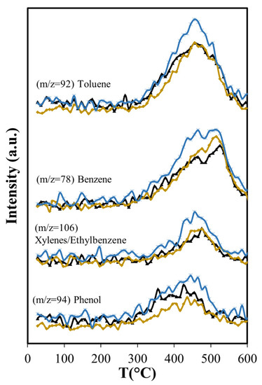 The production of monoaromatic hydrocarbons during ASB thermal decomposition is related mostly to lignin decomposition (see Figure 5b). The maximum production of BETX occurs above 450 °C, namely, 455 °C for toluene, 475 °C for xylenes/ethylbenzene, and 525 °C for benzene. Toluene and benzene have maxima between 350 °C and 600 °C. Both components have peaks that coincide at 455 °C, where maximum toluene emission occurs. The production of oxygenated aromatic compounds (phenol and benzyl alcohol) occurs within the same temperature range, starting at 300 °C and ending at 600 °C.