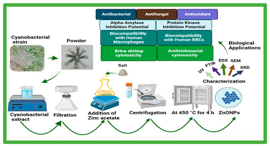 - El-Belely, E.F.; Farag, M.M.; Said, H.; Amin, A.S.; Azab, E.; Gobouri, A.A.; Fouda, A. Green synthesis of zinc oxide nanoparticles (ZnO-NPs) using Arthrospira platensis (Class: Cyanophyceae) and evaluation of their biomedical activities. Nanomaterials 2021, 11, 95. [Google Scholar] [CrossRef]
