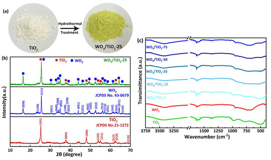 (a) Photograph of TiO2 before and after hydrothermal growth of WO3. (b) XRD patterns of TiO2, WO3, and WO3/TiO2−25. (c) FTIR spectra of TiO2, WO3, and WO3/TiO2 composites with different ratios.