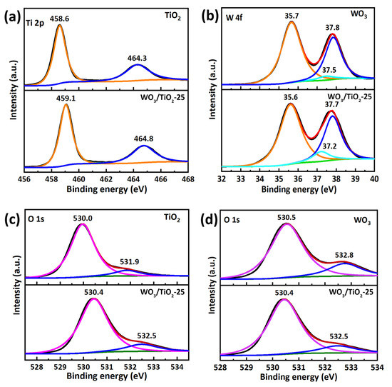 The element composition and valence of WO3/TiO2-25 composite were analyzed by X-ray photoelectron spectroscopy (XPS). Figure 3a shows the Ti 2p spectra of pure TiO2 nanoribbons and WO3/TiO2-25 heterojunctions. The pure TiO2 nanoribbons exhibit two XPS peaks at 458.6 eV and 464.3 eV, which correspond to Ti 2p1/2 and Ti 2p3/2, respectively. The energy gap between Ti 2p1/2 and Ti 2p3/2 peaks is 5.7 eV, revealing the oxidation state of Ti in TiO2 nanoribbons is +4 [36,47], which is also consistent with the XRD result. After the growth of WO3 nanosheets on TiO2, both the Ti 2p1/2 and Ti 2p3/2 peaks exhibit obvious red shifts from 458.6 to 459.1 eV and from 464.3 to 464.8 eV, respectively. This result suggests the conversion of Ti-O-Ti bonds to Ti-O-W bonds, which confirms the strong interaction between WO3 and TiO2 in the WO3/TiO2-25 heterojunctions [34,36]. Furthermore, the +4 oxidation state of Ti is unchanged after the formation of WO3/TiO2-25 heterojunctions as the energy gap between the peaks at 459.1 and 464.8 eV remains 5.7 eV. The W 4f XPS spectra of pure WO3 nanosheets and WO3/TiO2-25 heterojunctions are shown in Figure 3b. The two XPS peaks of pure WO3 nanosheets at 35.7 eV and 37.8 eV are attributed to W 4f7/2 and W 4f5/2, respectively. The energy gap between W 4f7/2 and W 4f5/2 peaks is 2.1 eV, which suggests that the W element existed in the form of W6+ in WO3 nanosheets [34,36]. For WO3/TiO2-25 heterojunctions, the binding energies of W 4f7/2 and W 4f5/2 peaks were both shifted to low energy by 0.1 eV, while the energy gap between these two peaks is unchanged, indicating the W6+ oxidation state in WO3/TiO2-25 heterojunctions [34,36,48], which is in good agreement with the XRD data. The high-resolution O 1s XPS spectrum of the samples is shown in Figure 3c,d. It can be seen that the Ti-O bond peak in TiO2 nanoribbons is located at 530.0 eV (Figure 3c), while the W-O bond peak in WO3 nanosheets is centered at 530.5 eV (Figure 3d). For WO3/TiO2-25 heterojunctions, the binding energy at 530.4 eV corresponded to the lattice oxygen of Ti4+-O or W6+-O, indicating that W-O and Ti-O shared the orbital O 1s in the W-O-Ti bond [32,43,44]. The peak exhibited a 0.4 eV up-shift from Ti-O bonds (from 530.0 to 530.4 eV) and 0.1 eV down-shift from W-O bonds (from 530.5 to 530.4 eV). The above XPS results show that the binding energy of Ti 2p shifted to high energy, while the binding energy of W 4f and O 1s shifted to low energy after the formation of WO3/TiO2-25 heterojunctions, confirming the electron density decrease on TiO2 and electron density increase on WO3, respectively [36,49,50]. The electron density change indicates that the photo-generated carriers have been successfully transferred between WO3 and TiO2 in the composite, which further proved the formation of WO3/TiO2-25 heterojunction structures [34,36].