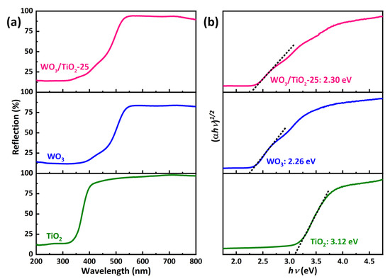 (a) Diffuse reflectance spectra for the TiO2 nanoribbons, WO3 nanosheets, and WO3/TiO2-25 heterojunction. (b) Plot of (αhν)1/2 as a function of photon energy (hν).