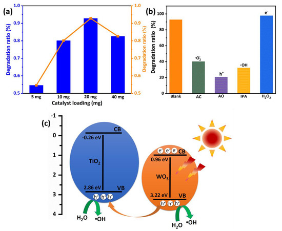 (a) The effect of WO3/TiO2−25 catalyst loading on RhB photodegradation ratio. (b) Trapping test for active species during RhB photodegradation with the WO3/TiO2−25 photocatalyst. (c) Proposed photocatalytic mechanism of WO3/TiO2 photocatalyst.