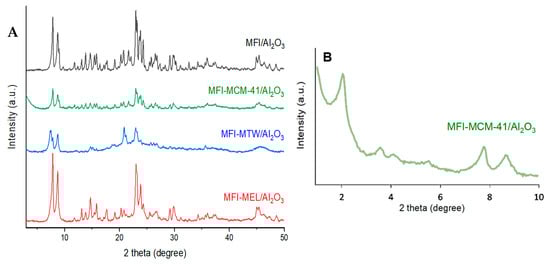 According to XRD patterns of the catalysts, all samples contain the MFI topology structure, as evidenced by the presence of specific-to-MFI reflections at 2θ = 7.9, 8, 23.2, 23.9, and 24.4° [46] (Figure 1A).