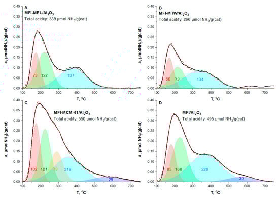 NH3-TPD profiles of ammonia: (A) MFI-MEL/Al2O3, (B) MFI-MTW/Al2O3, (C) MFI-MCM-41/Al2O3, (D) MFI/Al2O3 and their deconvolution into Gaussian peaks. The black solid line is the experimental curve. The red dotted line is the cumulative curve of Gaussian peaks. Numbers indicate the amount of acid sites corresponding to the peak, µmol NH3/g(cat).
