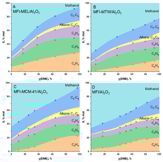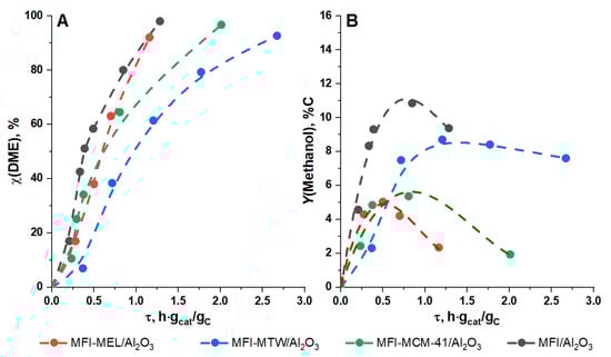 At the same time, the sample based on the zeolite MFI-MCM-41/Al2O3, which is characterized by the highest total acidity of 550 µmol NH3/g(cat), stands out from this sequence. The dependence of the DME conversion on the specified contact time for the MFI-MCM-41/Al2O3 catalyst lies below the analogous curve for the MFI/Al2O3 standard sample. Furthermore, on the MFI-MCM-41/Al2O3 sample, there is a significant decrease in the yield of methanol compared to the standard MFI/Al2O3 sample (Figure 3B). This is due to the fact that medium-strength acid sites (in the amount of 79 µmol NH3/g(cat)) of MCM-41 do not participate in the reaction of hydrocarbon synthesis from oxygenates, but activate the dehydration of methanol with the formation of DME, as was shown in [65,66]. Therefore, for the sample based on the MFI-MCM-41 zeolite, not only are hydrocarbons formed due to the structure of the MFI, but the additional formation of the DME from methanol also occurs due to the presence of MCM-41.
