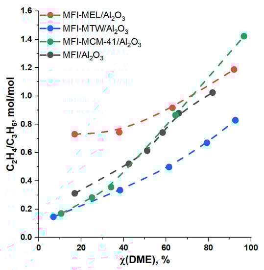 The MFI-MCM-41/Al2O3 catalyst is characterized by the product distribution, which can be defined as “average” between the two samples MFI-MEL/Al2O3 and MFI/Al2O3. Like MFI-MEL/Al2O3, it has a high ethylene and propylene selectivity—12.5 and 20.5% at 50% DME conversion, and 23.0 and 16.4% at 95% DME conversion (Figure 4C), respectively. At the same time, the selectivities of C5–C8 hydrocarbons and C1–C4 alkanes on the MFI-MCM-41/Al2O3 are the highest: up to 30% mol. and up to 12% mol, respectively. An additional feature of this catalyst is a sharp increase in the ethylene/propylene ratio from 0.18 to 1.4 with an increase in DME conversion. The ratio increases due to an increase in the ethylene selectivity from 1.7 to 12.3% mol, while the propylene selectivity remains approximately constant at 15–20% mol over the entire range of DME conversions (Figure 5).