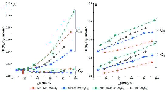 In comparison to other samples, the MFI-MEL/Al2O3 is characterized by a high HT-index for C3 hydrocarbons (0.075 at a DME conversion of 95%) and minimum HT-index for C4 and C5 hydrocarbons (0.15 and 0.38 at a DME conversion of 95%).