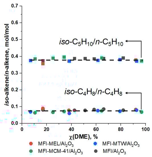 To estimate the isomerizing activity of the catalysts, the dependences of the iso-/n-alkenes mole ratio on DME conversion were plotted (Figure 7).