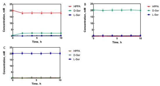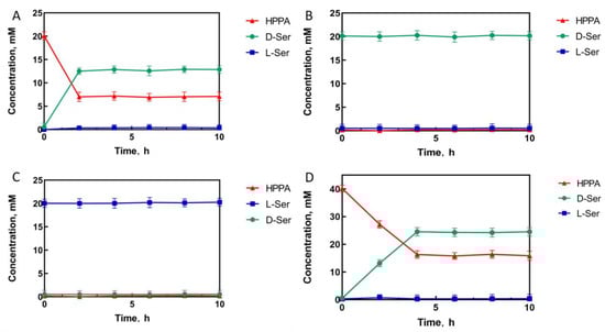 The mutant D92E/D122W/M152S (M3) catalytic process with HPPA ((A): 20 mM; (D): 40 mM), D-serine (B), and L-serine (C) as substrates, respectively.