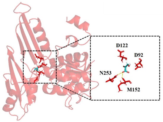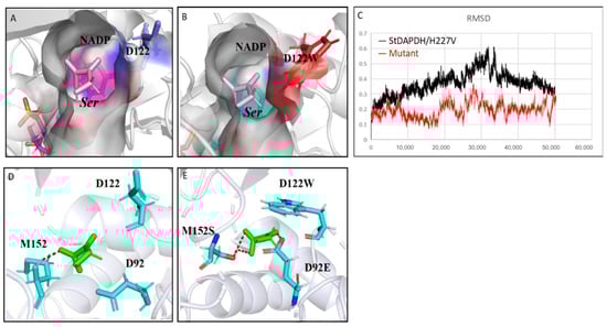 According to Figure 3D, most of the mutants with increased enzyme activity have the corresponding amino acid residues containing a hydroxyl group at D92, M152, and N253. The kinetic parameters of D92E, M152S, and N253Y with highly increased enzyme activity were measured. The specific activity of D92E, M152S, and N253Y increased by 2.61-, 2.27-, and 2.01-fold, respectively, compared with StDAPDH/H227V (Table 1). This result shows that the increase in the enzyme activities of D92E, M152S, and N253Y was due to the improvement of their affinity toward HPPA. Most of the mutants with increased enzyme activity at D122 have the corresponding amino acid residues containing bulky groups (Figure 3D). The kinetic parameters of D122W with highly increased enzyme activity were measured. The specific activity of D122W increased by 3.92-fold compared with StDAPDH/H227V, and the kcat value increased from 1.09 ± 0.02 s−1 to 3.44 ± 0.05 s−1 (Table 1), which was the major contributor to the improved catalytic efficiency. This indicates that the increase in the enzyme activity of D122W was due to the improvement of the conversion rate from HPPA to D-serine.