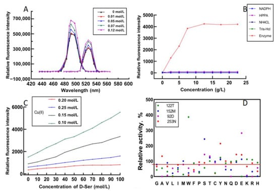 High-throughput screening of the mutants with Cu(II) calcein complex. (A) Excitation (left) and emission (right) wavelengths of Cu(II) calcein complex in the absence and presence of D-serine. (B) Fluorescence intensities for different concentrations of HPPA, NADPH, NH4CL, Tris-HCl, and enzyme. (C) Fluorescence intensities of different concentrations of D-serine and Cu(II) at the same enzyme concentration (2 g/L) and calcein concentration. (D) Relative activities of the screened mutants.