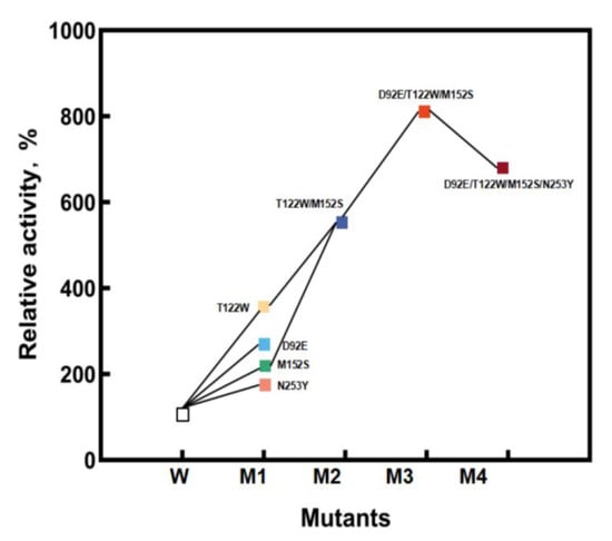 In order to further improve the catalytic activity, D92E, D122W, M152S, and N253Y were used as templates for the separate saturation mutagenesis of the other three sites (Figure 4). It was found that when D122W or M152S was used as the template, the enzyme activity of the D122W/M152S (M2) mutant increased markedly. Then, D122W/M152S was used as the template, and the other two sites were saturated. The screening library obtained the mutant D92E/D122W/M152S (M3) with an obvious increase in enzymatic activity. Finally, using the M3 mutant as the template, saturation mutation was performed on the N253 site.