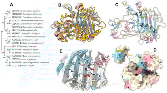 Phylogenetic analysis and homology model of the endoglucanase TtCel7B. (A) Phylogenetic tree of TtCel7B (TtCel7.1) and close CAZy GH7 proteins. The sequences were retrieved from GenBank, Uniprot, and PDB. (B) A 3D model of TtCel7B of superimposed with template structures from T. harzianum [PDB id 5W0A], R. emersonii [PDB id 6SU8], and F. oxysporum [PDB id 1OVW]. (C) Modeled structure, in the same orientation as in panel (B), with the β-strands, α-helices, and main loops highlighted. (D) Space-filling model of panel (C) linked with the cellulose-binding module (CBM). (E) Zoom-in of the modeled catalytic tunnel. Figure was prepared using UCSF ChimeraX.