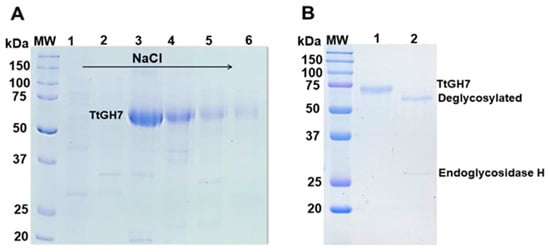 Purification of the recombinant endoglucanase TtCel7B from T. terrestris expressed in A. nidulans A773. (A) SDS-PAGE fractions (lines 1–6) eluted from the ion-exchange Hiprep Q-FF chromatography column. (B) SDS-PAGE of TtCel7B purified (line 1) from size exclusion Superdex 75 10/300 GL column and analysis of the enzymatic deglycosylation assay (lane 2), showing the purified TtCel7B after digestion treatment with endoglycosidase H. MW: molecular weight standard ladder is shown as kDa.