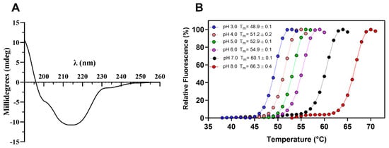Circular dichroism spectroscopy analysis of TtCel7B showed a typical β-class protein profile spectrum, with the minimum negative band at 214 nm and the absence of a negative band at 222 nm (Figure 4A), suggesting low content of α-helices [42,48,49,50]. Analyses of the CD spectral data with the DichroWeb server [51] showed regular content of β-strands and α-helices of 53% and 8%, respectively. In addition, the Differential Scanning Fluorimetry (DSF) technique was used for the determination of the melting temperature (Tm) of TtCel7B at different pH levels. As shown in Figure 4B, there was a variation in the Tm depending on the pH, with minimal values at pH 3.0 (Tm 48.9 ± 0.1) and maximum at pH 8.0 (Tm 66.3 ± 0.4), indicating a strong effect of pH on the TtCel7B structure (Figure 4B). Similar results for the effect of pH and temperature on the secondary structure were reported for GH7 Cel7A and Cel7B of T. harzianum [42,50].
