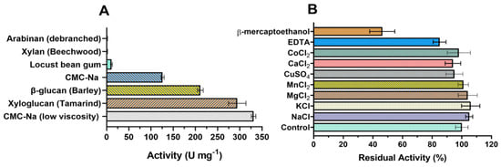(A) Substrate specificity of the endoglucanase GH7 from T. terrestris (TtCel7B). (B) Effect of different ions and compounds on TtCel7B activity against medium-viscosity CMC-Na.