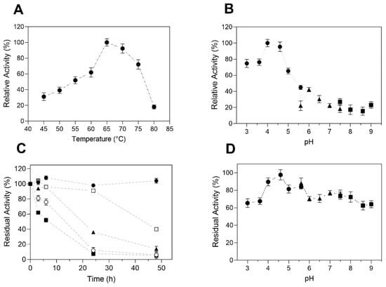 Effect of temperature and pH on TtCel7B activity and stability. (A) The effect of temperature on activity was determined with CMC as the substrate, at pH 4.0; (B) effect of pH on activity, at 65 °C. Key: (●) citrate buffer, (▲) phosphate buffer, (■) tris-HCI buffer. (C) TtCel7B was incubated for 48 h at temperatures of 45 °C (●), 50 °C (□), 55 °C (▲), 60 °C (○), and 65 °C (■). Residual activity corresponding to the activity before incubation (100%); (D) stability at different pH values for 24 h, with 100% of residual activity corresponding to the activity at pH 4.0. Key: (●) citrate buffer, (▲) phosphate buffer, (■) tris-HCl buffer. Results were expressed as the average of triplicate assays ± the standard error of the mean.