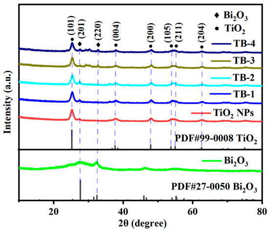 The X-ray diffraction (XRD) spectra of the catalysts are shown in Figure 1. As can be seen, the sample of TiO2 NPs showed diffraction peaks at 25.5°, 38.0°, 48.2°, 54.0°, 55.2° and 62.9°, which were attributed to the (101), (004), (200), (105), (211), and (204) crystal planes of the anatase-type TiO2 (JCPDS #99-0008) [19]. The above peaks were also found in the XRD spectra of the TiO2 NPs/Bi2O3 composites TB-x (x = 1–4), indicating the presence of TiO2 NPs. The intensity of the characteristic diffraction peak corresponding to the (101) crystal plane of TiO2 decreased gradually from TB-1 to TB-4 due to the decreasing content of TiO2 NPs in the composites. For pure Bi2O3, two peaks located at 27.95° and 32.39° were ascribed to the (201) and (220) crystal planes of β-Bi2O3 (JCPDS #27-0050) [20], whilst the diffraction peaks were weak and broad, indicating the formation of Bi2O3 with low crystallinity and small crystallite size [21,22]. These two peaks can also be observed in TB-x (x = 1–4) samples, meaning that the TiO2 NPs/Bi2O3 composites were successfully prepared.