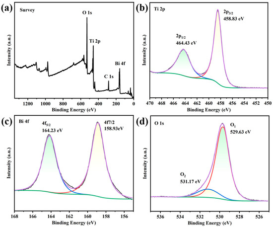 XPS spectra of TB-3: (a) survey, (b) Ti 2p, (c) Bi 4f, and (d) O 1s.