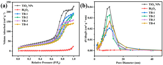 (a) N2 absorption–desorption isotherms, (b) corresponding pore size distributions of the TiO2 NPs, Bi2O3, and TB-x (x = 1–4).