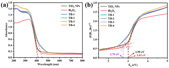 The UV–vis diffuse reflection spectra (DRS) of TiO2 NPs, Bi2O3, and TB-x (x = 1−4) composites are shown in Figure 6a. Their band gap (Eg) values were determined, as shown in Figure 6b, according to the Tauc equation [29]: Ahν = B(hν − Eg)n/2, where A, hν, and B are the absorption coefficient, incident photon energy, and a constant, respectively. The value of n depends on the type of semiconductor, which is 1 for direct semiconductors and 4 for indirect semiconductors. For all TB-x (x = 1–4) samples, n = 4 was applied [30]. The absorption edge of Bi2O3 was around 412 nm and its Eg was estimated at 3.03 eV; while the TiO2 NPs showed an absorption edge at 420 nm with Eg = 2.99 eV. It is obvious that the light absorption range of TiO2 NPs was significantly enlarged to the visible light region, which is believed to be due to the size effect of the nanoparticles [31,32]. Compared with Bi2O3, the adsorption edges of TB-x (x = 1, 2, 3, and 4) displayed a slight red-shift. Importantly, TB-3 showed enhanced absorption in the visible region of 400–500 nm. The Eg values of TB-x (x = 1, 2, 3, and 4) were estimated as 2.96 eV, 2.79 eV, 2.75 eV, and 2.96 eV, respectively. It is obvious that TB-3 possessed the narrowest Eg (2.75 eV) among the four TB-x samples, which is beneficial to improving its visible light absorption property. This result indicates that the band gap of 0D/2D TiO2 NPs/Bi2O3 nanosheet heterojunctions depends on the amount of Bi2O3 and TiO2 in the TB-x composites.